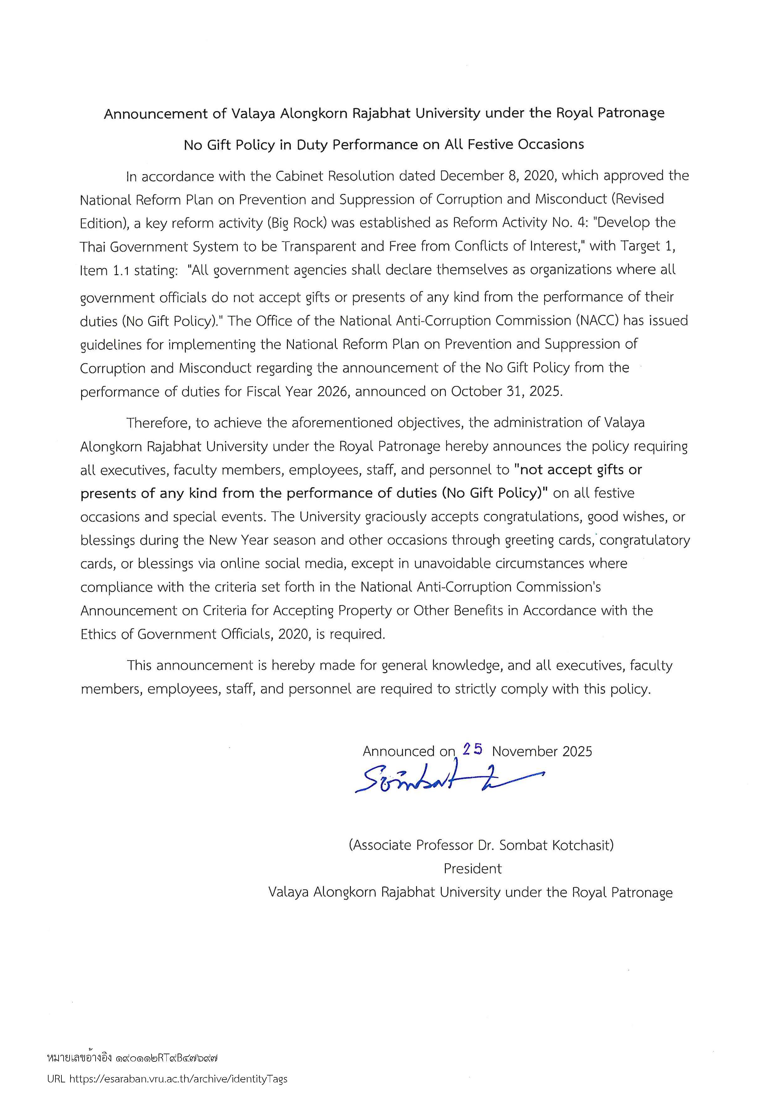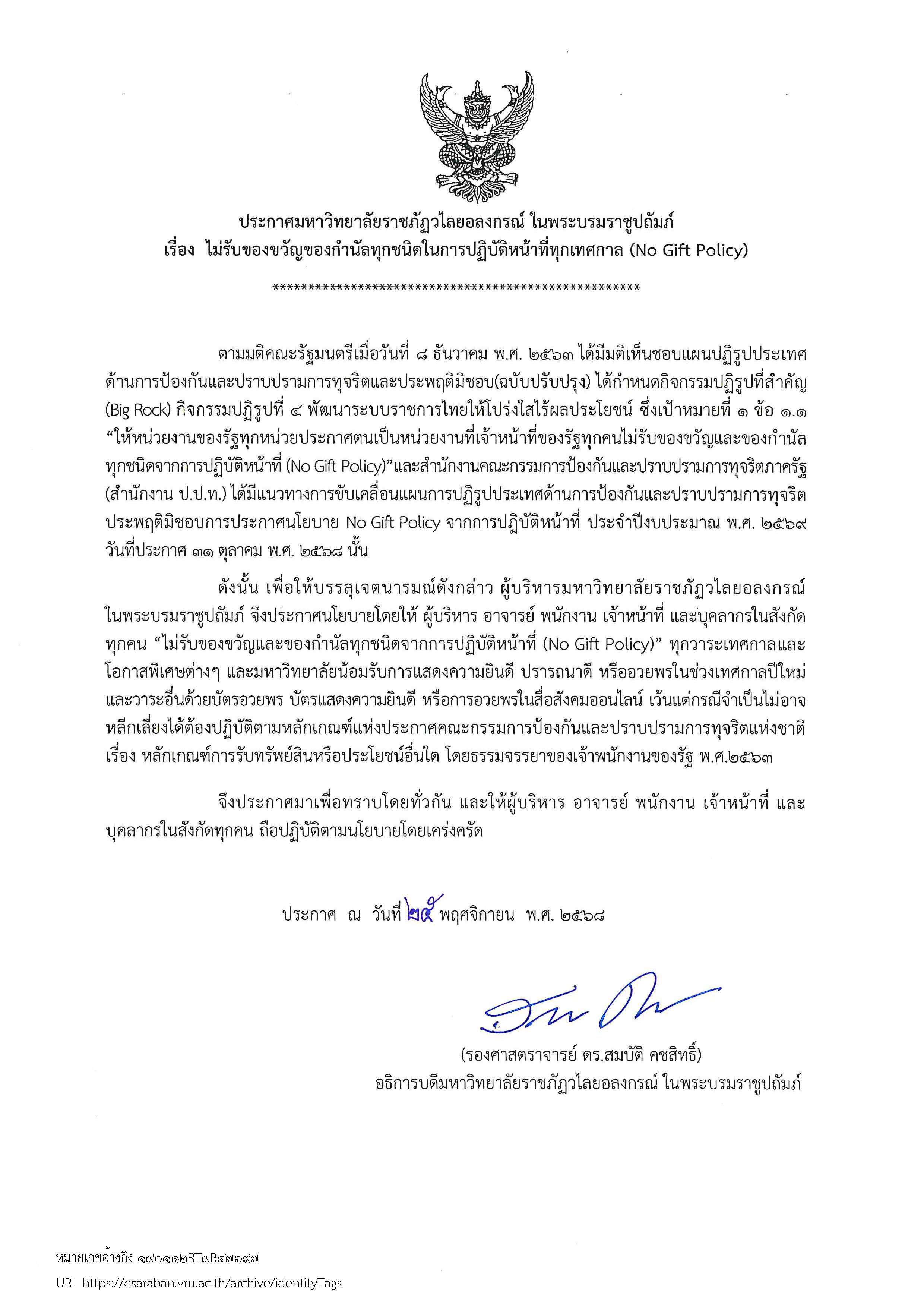๒. งครับ งดให้ ของขวัญ และของกำนัลทุกชนิดจากการปฏิบัติหน้าที่ จากบุคคลหรือหน่วยงานภายนอก ที่มาติดต่อมหาวิทยาลัยราชภัฏวไลยอลงกรณ์ ในพระบรมราชูปถัมภ์