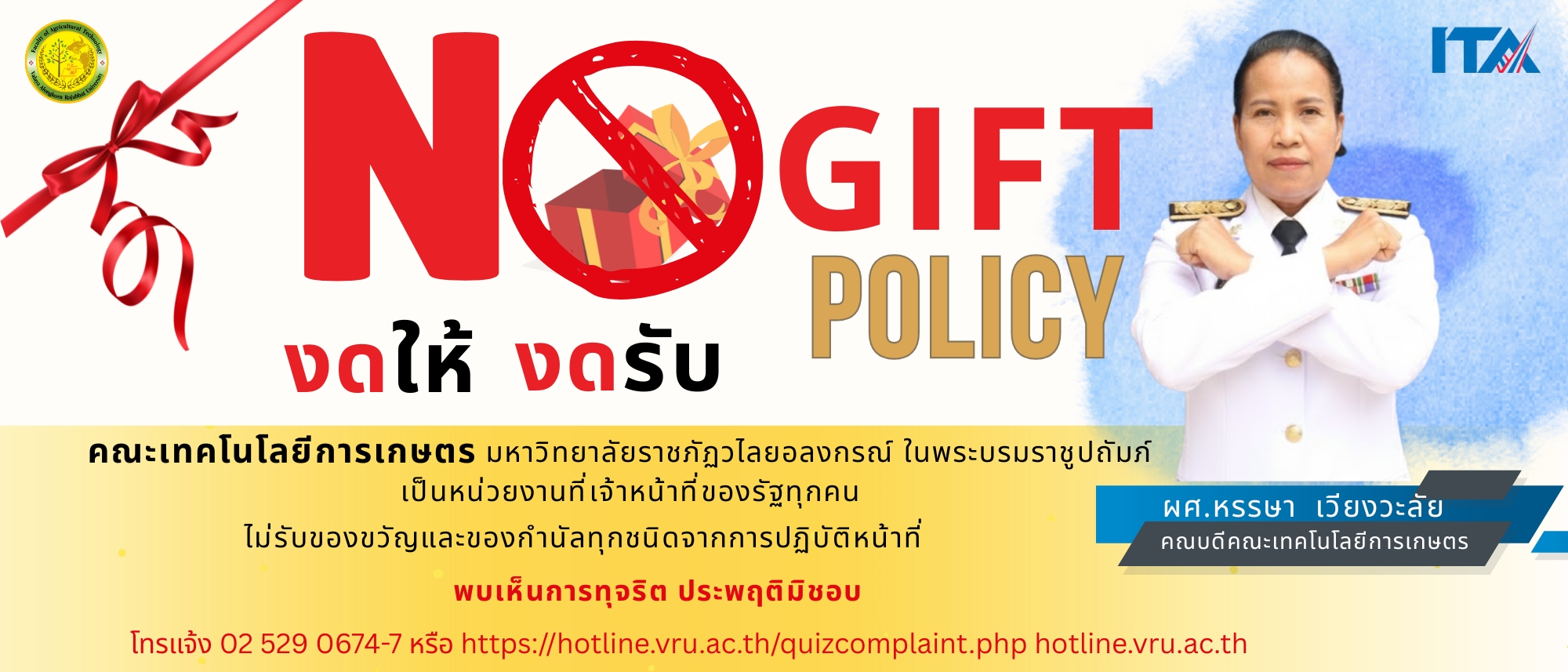 และของกำนัลทุกชนิด ทั้งก่อน ขณะ และหลังปฏิบัติหน้าที่ (No Gift Policy) โดยขอให้ผู้บริหาร อาจารย์ พนักงาน เจ้าหน้าที่ และ บุคลากรในสังกัด คณะเทคโนโลยีการเกษตร ถือปฏิบัติตามนโยบาย ดังนี้